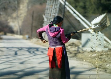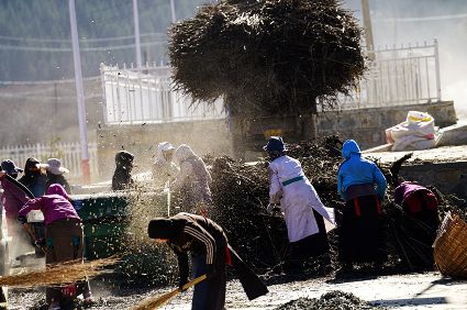 陽光溢彩的早晨,我已經(jīng)從對(duì)面山上的柏木林里回來了。中午時(shí)分,村里的人們又開始打碾豆子了,那場面十分誘人。感覺上我已經(jīng)離開村子很遠(yuǎn)了,而在車巴河岸邊,我又一下回到了村子。勞動(dòng)的人,那個(gè)不冰清玉潔呀!