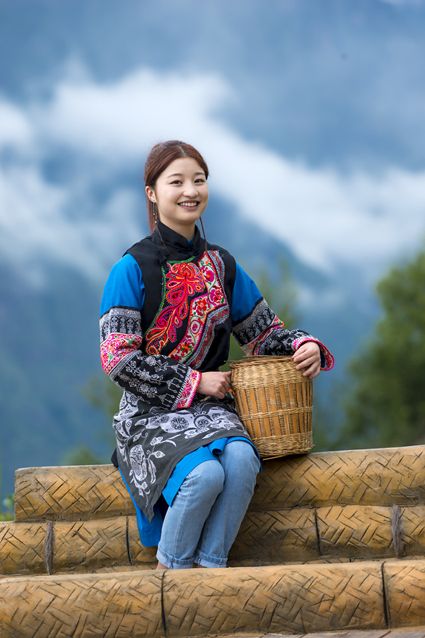 待日上三竿,陽(yáng)光斜射穿越云霧,采茶姑娘身著客家服,藍(lán)黑格調(diào),綴以手繪圖紋,頭戴角形斗笠。嫣然而笑。瞬間清潤(rùn)心間,討一捧新茶至云上茶居,沏茶邀友。