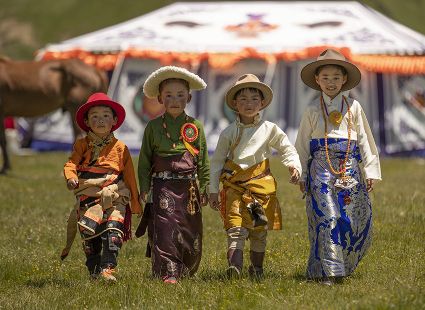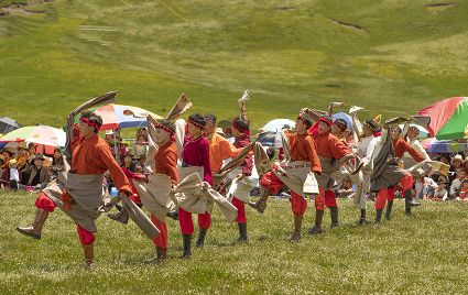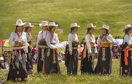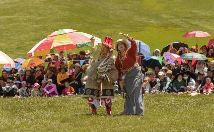 據(jù)說早在吐蕃時(shí)期,人們以村寨為單位,在本教僧人的帶領(lǐng)下高舉幡桿,手拿青棵、麥穗,繞田間地頭轉(zhuǎn)圈,祈禱神靈保佑,獲得豐收。儀式結(jié)束后,就在草場上展開角斗、斗劍、耍梭標(biāo)等活動(dòng)。格魯派興起后,這一活動(dòng)仍得到保留,只是在繞地巡游時(shí),人們要舉佛像、背經(jīng)文,文體活動(dòng)也增加了賽馬、射箭、馬術(shù)、藏戲、民間歌舞等內(nèi)容。解放后,革去了繞地巡游等一些宗教儀軌,增加了許多休閑娛樂、物資交流的內(nèi)容?!巴?jié)”沒有固定日期,各地根據(jù)農(nóng)事而定,一般在秋收前(8月)擇吉日舉行,時(shí)間1-3天。