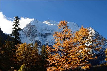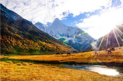 從稻城前往亞丁的路上會(huì)穿越川西風(fēng)光最美的彩色林帶,領(lǐng)略神奇的四季更替;洛絨牛場(chǎng)上的移動(dòng)牧群點(diǎn)綴在一片金黃之中,猶如浮動(dòng)的云朵,煞是好看。