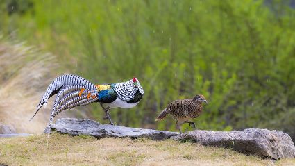 4月16日,筆者在康定市雅拉鄉(xiāng)境內(nèi),再次拍攝到國家二級保護動物白腹錦雞求偶的清晰視頻。一只色彩斑斕的雄鳥,拖著黑白相間的云狀斑紋尾羽,圍著雌鳥跳起了“圓舞曲”。整個求偶過程有十多分鐘。每年三至五月是白腹錦雞求偶期。