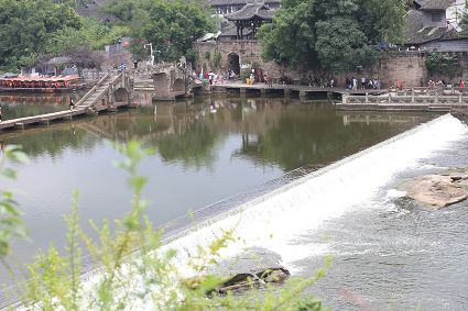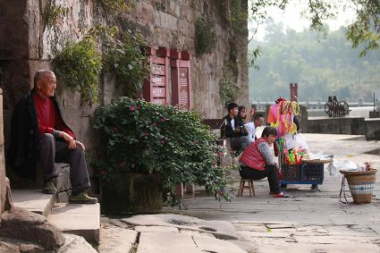 大榮橋。這座建在瀨溪河上、歷經數百年的古石橋,一頭連著大足的地盤,一頭連著榮昌的地盤,故名。看大榮橋的最佳觀景點設在大榮寨對面的萬靈山腰,從那里看大榮橋和橋拱那端毗鄰的大榮寨,一種看白描連環(huán)畫中古鎮(zhèn)的感覺,就冉冉升起了。