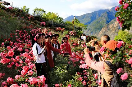 近日,丹巴縣甲居藏寨則姆花園20余畝玫瑰花競相綻放,美不勝收。漫步其中,曲徑通幽,遠處的墨爾多神山巍然聳立,山下的金川河奔騰高歌,四周的藏寨田園錯落有致,眼前的四季玫瑰驕艷似火,吸引了不少游人前來賞花、拍照、打卡,好一幅怡然自得的山水田園畫卷。