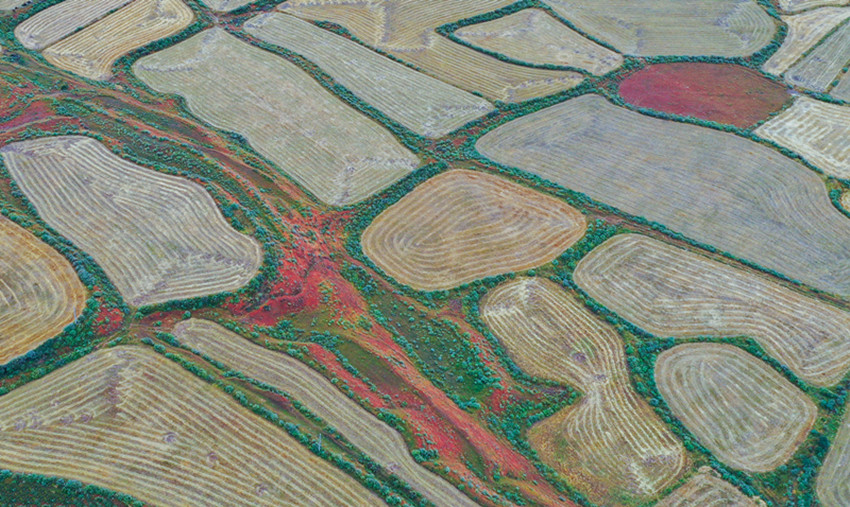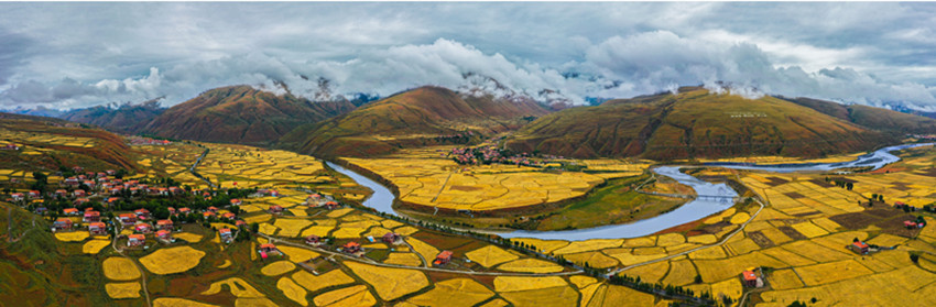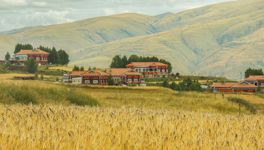 從立秋開始,陽氣漸收,萬物內(nèi)斂。在希望的田野上,主色調(diào)也從象征繁茂、成長的翠綠向代表成熟收獲的金黃漸變。爐霍縣蝦拉沱鎮(zhèn),藏房零星地點綴在田野間,成熟的農(nóng)作物漸染了整個秋季,讓這個小村莊如同一幅色彩斑斕的油畫。