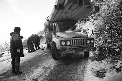 一九九七年十一月二十四日,連續(xù)多日大雪,把整個(gè)二郎山裹得嚴(yán)嚴(yán)實(shí)實(shí),白茫茫一片。陣陣山風(fēng)吹過(guò),大霧就像瀑布一樣,從山頂直往下翻涌?jī)A瀉。 一大早,州交通局打冰除雪排險(xiǎn)的干部職工就從二郎山管理站直奔山埡口。載有防滑砂的大貨車穿迷霧,繞山梁,向山頂埡口疾馳。由于氣溫太低,霧又大,車上的擋風(fēng)玻璃很快就結(jié)下了冰,路面打滑非常嚴(yán)重。前面車輛堵了起來(lái),排險(xiǎn)人員只好下車步行。 大霧彌漫,能見(jiàn)度很底,陰霾的天空又飄起了紛紛揚(yáng)揚(yáng)的雪花,剌骨的寒風(fēng)陣陣襲來(lái),只聽(tīng)見(jiàn)車蓬布在風(fēng)中“嗶剝”作響,卻看不見(jiàn)前面到底堵了多少車。排險(xiǎn)人員只好相互攙扶踩著冰滑的邊路艱難地向行。好不容易來(lái)到堵在最前面的車子面前。原來(lái)是一輛載著原木的東風(fēng)牌大貨車側(cè)滑在公路上,把整個(gè)公路堵死了。 局領(lǐng)導(dǎo)當(dāng)即指揮大家用鋼釬、鐵鎬和鋤頭處理冰道,沒(méi)有撮箕,大家借來(lái)加水桶裝運(yùn)冰雪……氣溫仍在急劇下降,剛從雪堆里刨出來(lái)的路,又被結(jié)起一層冰,就像地面上澆上了油,這就是冰雪道上有名的“桐油凌”。 有二位老同志不顧年老體弱,積極參與打冰除雪,一個(gè)在打冰時(shí),被彈起的冰碴把腦門劃了一個(gè)口子,鮮血直往外冒。有人想幫他包扎,他堅(jiān)決不干,自己就用手帕按住,把帽子向下拉蓋住傷口就算了。血從手帕中浸透出來(lái),與眉毛上的冰凌結(jié)在一起。氣溫太低,冰層太厚,十字鎬每挖一下,多數(shù)情況下也就是挖下一個(gè)白點(diǎn)而已。不一會(huì)兒,另一位老同志已是滿頭大汗,大家勸他休息一下,他卻說(shuō):趁著現(xiàn)在雪不是太大,早點(diǎn)把主道上的冰雪多除點(diǎn),過(guò)往二郎山的車輛就多一份安全。 排險(xiǎn)人員的手凍紅了,刨冰雪碰傷的指頭還流著鮮血,身上蒸發(fā)的熱氣,把衣領(lǐng)口、袖子口和褲子口結(jié)成了冰,可是,誰(shuí)也沒(méi)有吭一聲。 ……受堵車輛終于向前開(kāi)動(dòng)了。 風(fēng),越刮越猛,雪,越來(lái)越大。 防滑車在冰雪道上艱難地向前爬行著,車箱上面的職工們揮舞的洋鏟向路面撒著防滑砂。一路上風(fēng)絞雪,防滑車象一頭不聽(tīng)使喚的牛,顛簸、亂竄,好不容易才來(lái)到260(二郎山最險(xiǎn)處),對(duì)這里“桐油凌”路面進(jìn)行重點(diǎn)防滑處理后,防滑車又返回來(lái),開(kāi)始向山頂進(jìn)發(fā)……風(fēng)雪二郎山上打冰除雪、防滑排險(xiǎn),看似沒(méi)有驚天動(dòng)地的壯舉,身臨其景才知其艱難辛苦。難怪當(dāng)年每每經(jīng)過(guò)二郎山冰天雪地奇險(xiǎn)路段的車,都會(huì)向風(fēng)雪中屹立路邊的交通系統(tǒng)排險(xiǎn)保暢通的職工們鳴笛致敬,風(fēng)雪中的那份情彌足珍貴。 川藏線上的老司機(jī)傳下來(lái)一首傷心的順口溜:“車過(guò)二郎山,如闖鬼門關(guān),萬(wàn)幸不翻車,也要凍三天!”其險(xiǎn)峻實(shí)為罕見(jiàn),尤其是途經(jīng)二郎山260(公路公樁)處,曾被淡虎色變的人稱為“鬼招手”的險(xiǎn)路段。 1983年1月3日,有著安全行車44萬(wàn)公里記錄的一位駕駛員開(kāi)著輛嶄新的東風(fēng)牌貨車,同行還有兩名職工,夜行二郎山,在彌天大霧中神秘地“失蹤”了。十五天后,搜山的人才用望遠(yuǎn)鏡看到260公里路樁處的山崖下,有一塊汽車破篷布掛在樹(shù)枝,猶如招魂的凄厲幌幡在冷風(fēng)中招搖晃動(dòng)。鋼纜繩吊著搜山的人下到崖下400米深處的谷底。扒開(kāi)一座座雪堆,叫人汗毛倒豎:雪堆下,盡是廢大梁、爛車廂、銹車頭和支離破碎的汽車,足有一個(gè)汽車連!一輛不知埋了多久的卡車廂里牛肉已腐爛,駕駛室里坐著三具發(fā)黑的僵尸……其狀慘不忍睹!