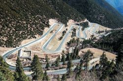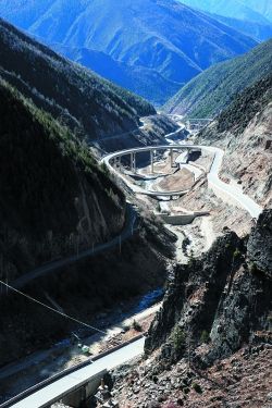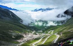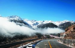 瀘定縣雅家埂,通往海螺溝景區(qū)的道路彎彎曲曲盤(pán)旋在山間。