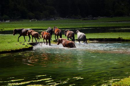 康定蓮花湖有純凈的陽光、湛藍(lán)的天空、綠毯般的高山草甸、燦若繁星的野花、藍(lán)寶石般的高原湖泊、銀鏈般的溪流迂回盤旋、高大的康巴駿馬,還有在風(fēng)中獵獵飛舞的經(jīng)幡。