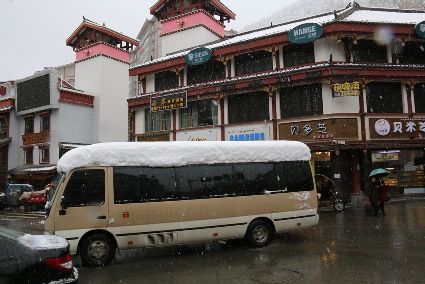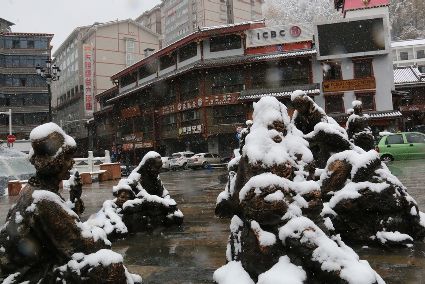 當天,記者來到康定城區(qū),一路上看到,從新城下來的車輛,有的車頂上都頂上了20公分左右的“雪帽”了。