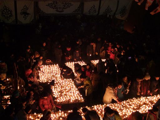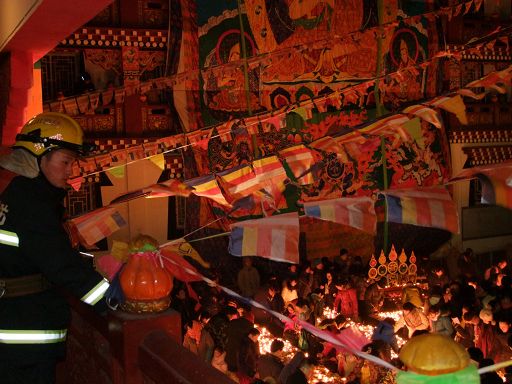 康定的幾座黃教寺廟舉行了法會,擺酥油花,燃元根燈供佛。信教群眾除在家供燈外,有的還登跑馬山,赴南無寺敬燈油。入夜后又成群結(jié)隊涌向康定城中的安覺寺,參加元根燈會,以此紀(jì)念藏傳佛教格魯派創(chuàng)始人、宗喀巴大師圓寂成佛。安覺寺里人潮涌動,熱鬧非凡。有扶老攜幼的信教群眾,有祈求平安的生意人,也有慕名而來的外地攝影師。燈會這天,最忙碌的除了寺廟里的喇嘛,就數(shù)在寺廟周圍站崗的消防員了,消防員李剛說:“一大早就有遠道而來的信教群眾和僧尼到寺廟里點燈了,為了保障寺廟的消防安全,我們已經(jīng)在這飄著雪花的冬日里站了整整一天了,要等到每一盞燈都安全的燃盡,我們才可收隊離開。”