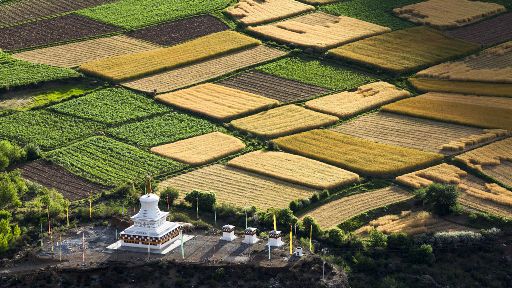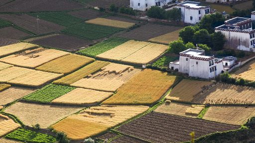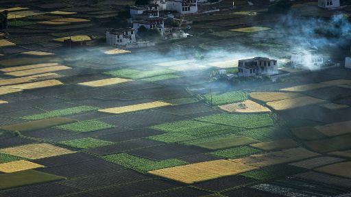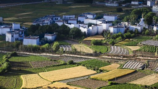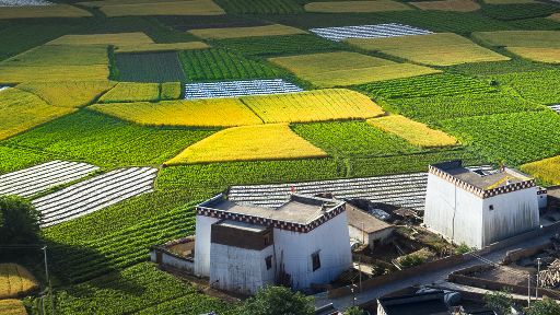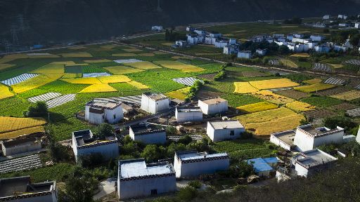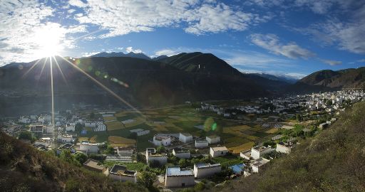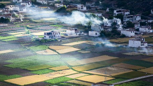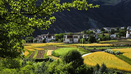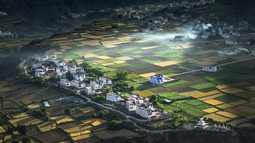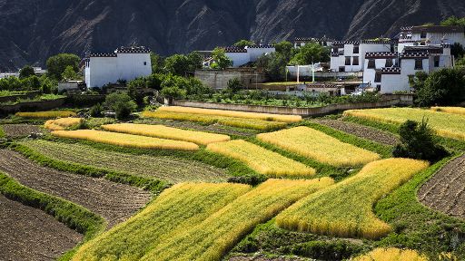 清晨,瓦藍(lán)瓦藍(lán)的天空云霧繚繞,周?chē)木拔镆黄鼥V,就好像童話里的仙境,一會(huì)兒,太陽(yáng)從東邊冉冉升起,霧也漸漸消失,村子里屋頂上飄著裊裊煨桑的煙子,我站在山岡上從高處向下俯望,只見(jiàn)高山峽谷之中,層層翠綠的梯田簇?fù)碇l(xiāng)城特有的白藏房,山下的田野,就像一片金色的海洋,將秀麗的田園裝扮得更加如詩(shī)如畫(huà)。一陣晨風(fēng)吹過(guò),麥田上蕩起了一道道金色的波紋,遠(yuǎn)處傳來(lái)了畫(huà)眉鳥(niǎo)的歌聲,我被眼前的一切迷住了,仿佛一切都靜止了,她讓我的夢(mèng)從這里開(kāi)始。
