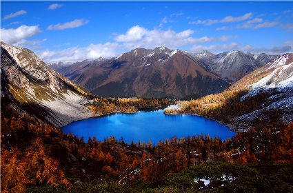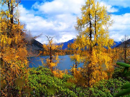 丹巴的秋是有著美麗色彩的季節(jié),你瞧,在峽谷兩岸的山巔,那一簇簇綠樹在一夜之間竟然點綴上了黃的、紅的顏料,就像是一名丹青能手不小心間打翻了調色盤,讓那些靈動的顏料在樹冠上潑灑。黃色的樹葉正印證了“滿樹盡帶黃金甲”的意境,黃得透徹,黃得潔凈。而那些紅色的樹葉,猶如盛開的鮮花,在逐漸蕭條的秋日里顯露出勃勃生機……那一片片黃紅綠相間的顏色,一寸一寸的往下挪移,讓看慣了春色綠野滿山的人們驚呼大自然的鬼斧神功之作。山腰,蔥綠的樹一棵連著一棵,密密層層,頑強地抵抗著秋風的寥落,然而,那黃的紅的顏料終歸于要流向峽谷底,所經之處,風刺骨,葉瑟縮,大地又將再次被剝蝕掉華麗的外衣,露出山的嶙峋。我想,在山巔,那些樹葉在秋寒的作用下,依依不舍地與樹枝作別,隨風抖落,在樹林中上下翻飛,猶如一只只美麗的彩蝶在林中翩翩起舞,當落到地面上時,發(fā)出生命即將逝去時的低低嘆息聲,然而那哀傷卻沒有醞釀太久,幾只小蟲迅速地聚集在葉片底下,為尋找到過冬的庇護所而興奮不已,那些葉片也感受到了生命存在的意義,為自己即將化為塵土前還能再次發(fā)光發(fā)熱而激動。跟隨著秋的步伐,獨自一人穿行在秋色滿滿的樹林中。眼前,一片片落葉漫空飛舞,伸出雙手,讓那些黃的紅的葉片降落在手心里,一絲淡淡的蘋果香味從小小的葉片中透出,悠悠的在我鼻尖縈繞。那一片片落葉,不正是秋日向大地母親發(fā)出的明信片嗎!春夏兩季,大地母親用自己的乳汁哺育著這些葉片,泛著健康的綠色,渲染了大地,茁壯的成長。那透心的綠,將大地裝扮得格外的妖嬈,充滿了無限的活力。秋日漸近,它們在秋風的浸透下,剝蝕掉綠色的外衣,消耗掉多汁的綠葉,逐漸的消瘦,最后薄如蟬翼,在秋風的吹拂下,在大地母親的召喚下,終于脫離枝條,晃晃蕩蕩的飄向地面。