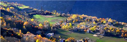 丹巴的秋似乎來得更晚一些,當羌塘高原上的雪花從彤云密布的天空中飄灑下來,雅礱江上游滴水已成冰的時候,那秋才帶著陣陣涼意,伴隨著飄飄蕩蕩的白云,跨過雪域高原,翻過崇山峻嶺,載著五顏六色的夢想,悄悄的眷顧上這塊還郁郁蔥蔥的峽谷。就這樣,秋在不經意間劃過峽谷兩岸,用自己特有的方式,渲染了所有的景色,漸漸瘦弱了山的肌膚。