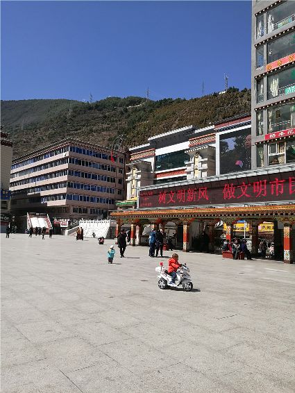 天空像剛被浸染的綢緞,蔚藍的主色已經(jīng)略顯;白雪好似從浸染的綢緞上滴落下的顏料與其它顏色的混合,眷戀的駐足在山尖,在其耳旁傾訴來年的約定;一顆顆萬年青穩(wěn)穩(wěn)的站立,將山中的寺廟、亭閣緊緊地包圍,見證著康定四季輪回的變化;依然披著秋冬贈予黃色外衣的樹木,拋開桎梏,堅守在一座座樓房旁。藍與白,黃與綠……這大美的晴天為人們帶來了別樣的視覺盛宴。