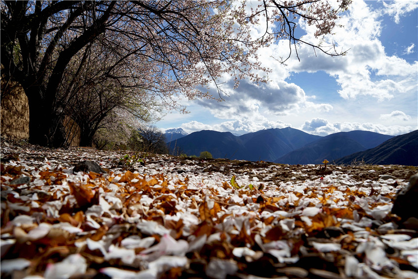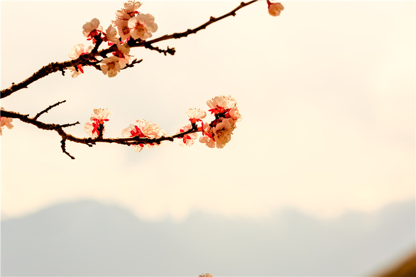 爛漫桃花的暖與遠方高聳雪山的冷,