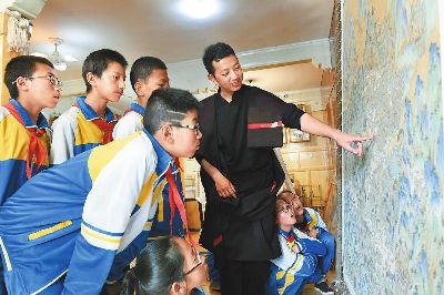 著著是當?shù)匦∮忻麣獾漠嫀煟?4歲從臨摹、勾線定型、著色染色開始學起,3年后就出師獨立作畫。17年時間,他繪制了3000多平方米的壁畫和數(shù)百幅唐卡,光筆就畫禿了20000多支。去年,著著憑借《南絲路一帶緣藏漢人一家親》成為當年文藝界最高獎山花獎的獲得者。今年,他圍繞“一帶一路、藏漢和睦”為主題而創(chuàng)作的大幅唐卡畫作也即將收尾。