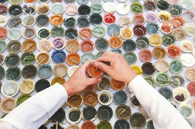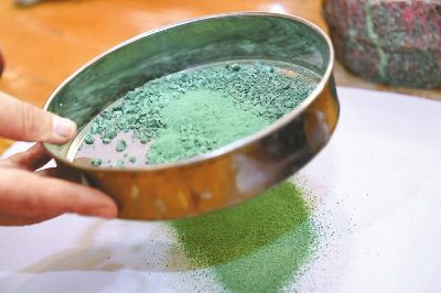傳統(tǒng)的唐卡是藏族文化中一種獨具特色的繪畫藝術(shù)形式,需經(jīng)繃布、打磨、定位、起稿、涂色、暈染、拉線條、拉金線等多種程序,天然原料作色保證了畫作幾百年后色澤還依然鮮艷。在著著的畫室里,擺放了百個裝滿各色礦物質(zhì)顏料的調(diào)色小碗,“上色用的是延續(xù)千年的礦物研磨顏料?!睘榱俗岊伭献魃鶆?,著著還用自己的辦法搞出了專用的顏料攪拌機。