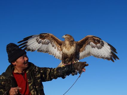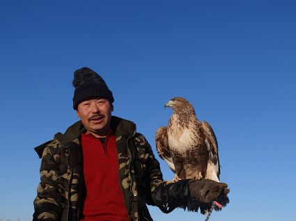 “小一點(diǎn)的鷹好訓(xùn),訓(xùn)老一點(diǎn)的叫熬鷹。 開(kāi)始熬鷹前,一次性喂飽鷹,七天七夜不吃不喝不睡覺(jué),待七天時(shí)到,放鷹于空,手中拿肉,用我們倆特殊的交流方式指揮它,這時(shí)它會(huì)落我的手臂上。但是,這一只始終沒(méi)服過(guò)我。訓(xùn)出來(lái)一只大約半月左右?!庇?xùn)鷹人說(shuō)。