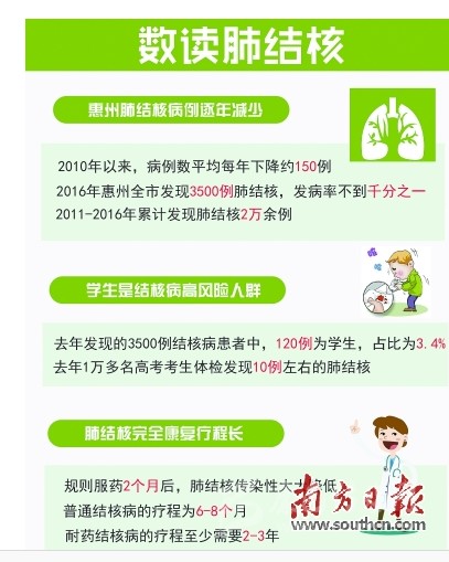 據(jù)惠州市結(jié)防所相關(guān)負(fù)責(zé)人介紹,惠州市近年(2011—2016年)發(fā)現(xiàn)肺結(jié)核病例2萬余例,絕大部分患者都能治愈,治愈率達(dá)到90%以上。2010年的一項(xiàng)流行病學(xué)調(diào)查顯示,惠州市結(jié)核病發(fā)病率為千分之二,目前這一數(shù)字已降至不到千分之一?!叭ツ臧l(fā)現(xiàn)3500例,發(fā)病率略低于全省平均水平,并且發(fā)病趨勢(shì)近年來逐年下降,2010年以來,病例數(shù)平均每年下降約150例?!眲⒅緰|表示,這跟防控工作的成效以及人們防護(hù)意識(shí)的提高密不可分。然而,目前結(jié)核病的防治仍然面臨嚴(yán)峻的形勢(shì):一是發(fā)病人數(shù)多;二是耐藥結(jié)核病流行;三是學(xué)校存在發(fā)生結(jié)核病疫情的潛在風(fēng)險(xiǎn)。