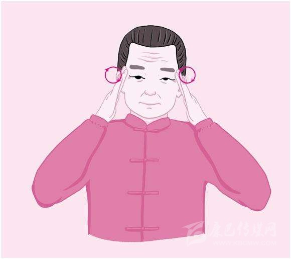 2.按揉太陽穴:順時針旋轉(zhuǎn)一周為一拍,約做32拍。