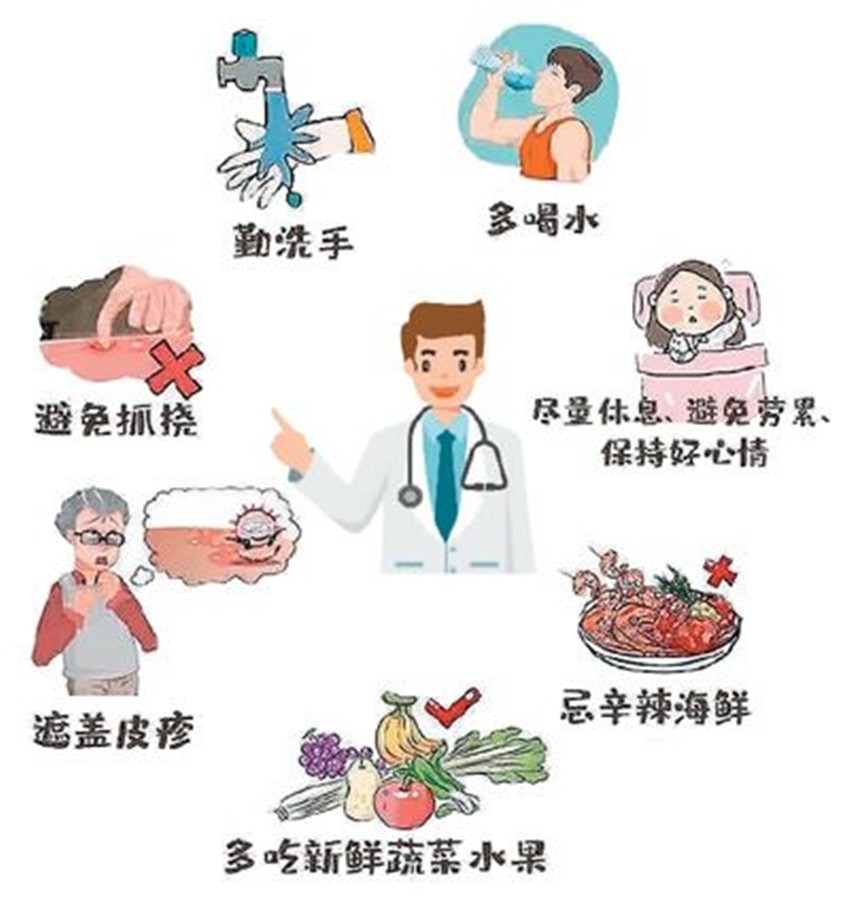 專家提醒,帶狀皰疹主要通過接觸傳播,抵抗力低的老年人和兒童應避免接觸帶狀皰疹患者。與此同時,中老年人以及有自身免疫缺陷的人群要注意休息,合理飲食,加強鍛煉,增強抵抗力;糖尿病、腫瘤等患病人群,要特別留意觀察自身免疫狀況,養(yǎng)成良好生活習慣,有效控制原有疾??;年輕人也不能掉以輕心,避免頻繁加班、熬夜等導致抵抗力下降。一旦發(fā)現(xiàn)患有帶狀皰疹,要盡快就醫(yī),同時注意避免抓撓皮疹處,勤洗手、多喝水、多吃新鮮蔬果,忌辛辣及海鮮,多休息,避免勞累,保持好心情。