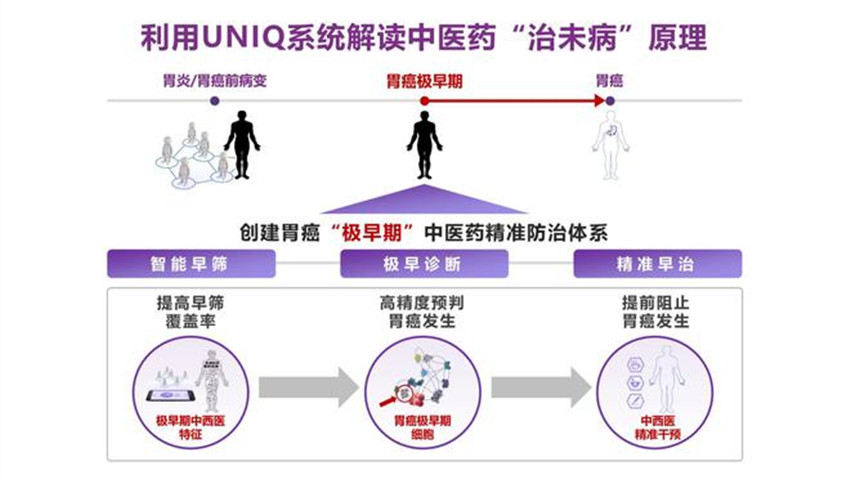 利用UNIQ系統(tǒng),結(jié)合大規(guī)模臨床病例的采集和檢測(cè),李梢?guī)ьI(lǐng)團(tuán)隊(duì)發(fā)現(xiàn)了胃癌“極早期”這一全新的階段,中醫(yī)上主要表現(xiàn)為本虛標(biāo)實(shí)、寒熱失衡。從中醫(yī)典型病例中還發(fā)現(xiàn)寒、熱舌苔菌群等新型標(biāo)志物,尤其是首次構(gòu)建了胃炎癌轉(zhuǎn)化的單細(xì)胞網(wǎng)絡(luò),發(fā)現(xiàn)了與胃早癌細(xì)胞高度接近的胃癌極早期細(xì)胞。經(jīng)2700余例胃炎癌轉(zhuǎn)化序貫病例樣本驗(yàn)證,發(fā)現(xiàn)該標(biāo)志物能夠使得胃癌發(fā)生的預(yù)判提前10個(gè)月,準(zhǔn)確率達(dá)85%。探測(cè)出的胃癌極早期細(xì)胞如果處于萌芽期,進(jìn)行中藥干預(yù)就可能延緩甚至阻斷其癌變,有望為解決我國(guó)胃癌早診率低的難題提供突破口。