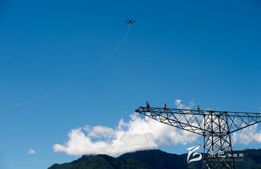 酒泉—湖南電力線路是我國目前輸電距離最長的±800千伏特高壓輸電工程,全長2383公里、投資262億元,預(yù)計于2017年2月建成投運(yùn)。酒湖線重慶巫溪段共110基輸電鐵塔,70%位于山脊,93.6%的建造需要架設(shè)專用運(yùn)輸索道。 圖為7月15日,掛載著第一級牽引導(dǎo)線的放線無人機(jī)在空中懸停配合高空作業(yè)人員完成架線作業(yè)。