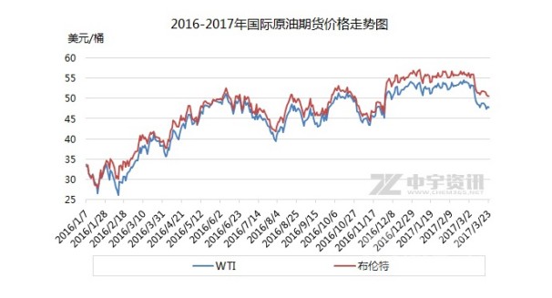 2017年3月以來(lái),國(guó)際油價(jià)持續(xù)走低。3月7日,美國(guó)WTI原油期貨在53美元形成下行拐點(diǎn),隨后連跌四日,在48、49美元附近持穩(wěn)數(shù)日后繼續(xù)小幅下跌。截至3月24日收盤(pán),美國(guó)WTI原油期貨報(bào)47.97美元/桶。