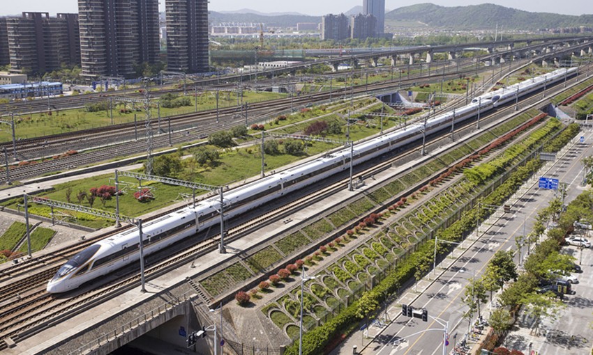 一列“復(fù)興號(hào)”動(dòng)車組列車行駛在京滬高鐵南京市境內(nèi)。 新華社發(fā)