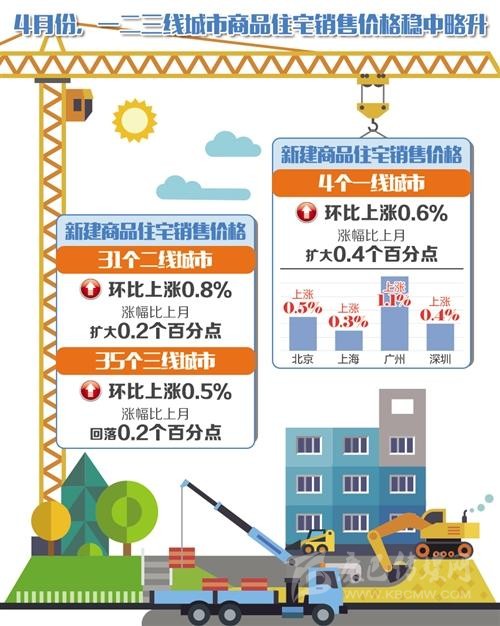 國家統(tǒng)計局城市司高級統(tǒng)計師劉建偉表示,4月份一線城市新建商品住宅和二手住宅銷售價格環(huán)比漲幅均略有擴大;二線城市新建商品住宅銷售價格漲幅擴大,二手住宅漲幅回落;三線城市新建商品住宅銷售價格漲幅回落,二手住宅漲幅微升。