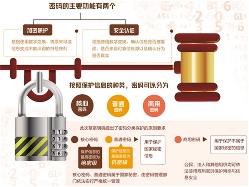 按照保護(hù)信息的種類,密碼可以分為核心密碼、普通密碼和商用密碼。此次草案明確提出了密碼分類保護(hù)的原則要求:核心密碼、普通密碼用于保護(hù)國(guó)家秘密信息,核心密碼保護(hù)信息的最高密級(jí)為絕密級(jí),普通密碼保護(hù)信息的最高密級(jí)為機(jī)密級(jí);核心密碼、普通密碼屬于國(guó)家秘密,由密碼管理部門依法實(shí)行嚴(yán)格統(tǒng)一管理。商用密碼用于保護(hù)不屬于國(guó)家秘密的信息;公民、法人和其他組織均可依法使用商用密碼保護(hù)網(wǎng)絡(luò)與信息安全。