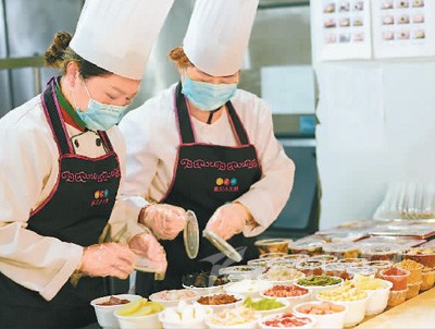 近日,重慶通過線上點單、“零接觸”配送等方式,讓老百姓在家里也能吃上熱騰騰的火鍋。圖為重慶小天鵝火鍋標準化生鮮火鍋外賣的門店內(nèi),2名后廚工作人員對生鮮火鍋外賣訂單的菜品進行封裝。新華社記者 劉潺 攝