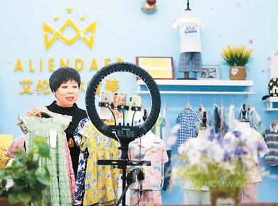 5月15日,位于山東省青島市即墨區(qū)的青島艾倫達(dá)爾服飾有限公司營銷人員通過云直播推介產(chǎn)品。