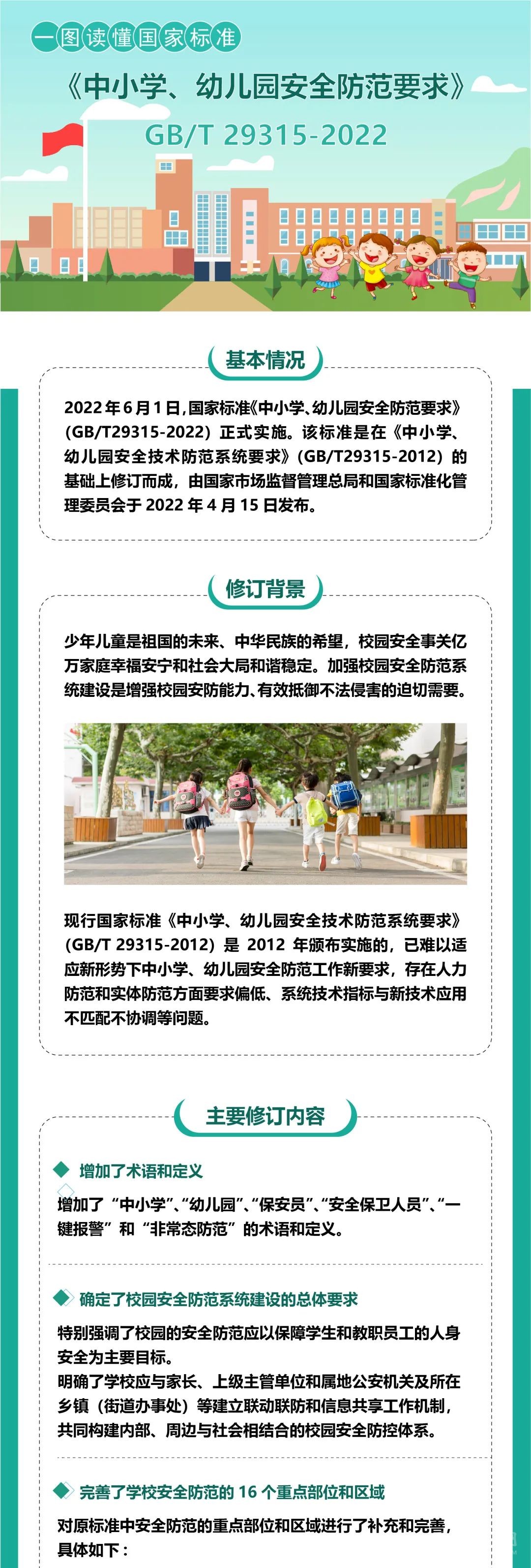 據(jù)市場監(jiān)管總局消息,近日,《中小學、幼兒園安全防范要求》(GB/T 29315-2022)(以下簡稱《要求》)經(jīng)市場監(jiān)管總局(標準委)批準發(fā)布,將于2022年6月1日起正式實施。