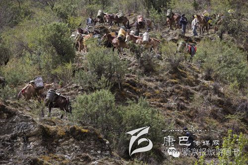 白玉縣,拉沙石的馬幫。 白玉縣,德沙村一民居內(nèi)孩子在帳篷邊玩耍。