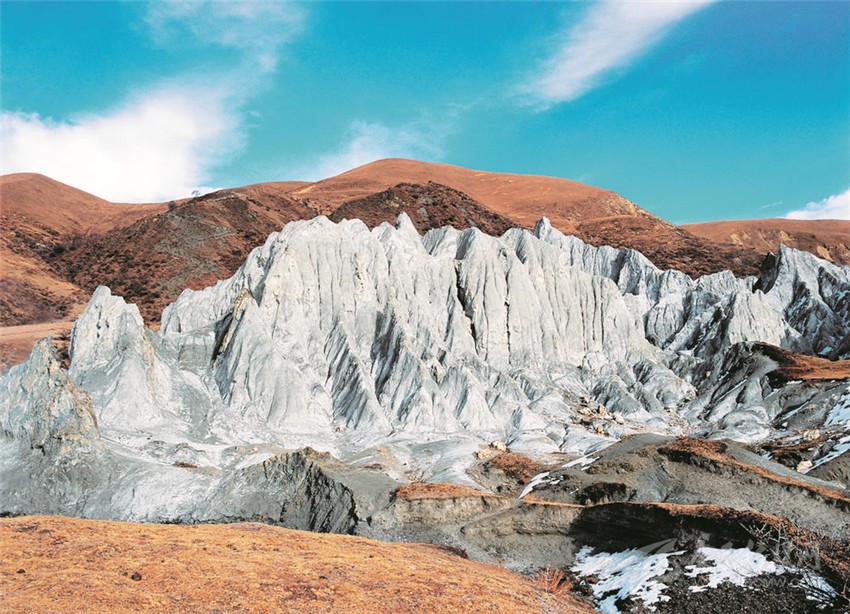 質(zhì)地較軟的糜棱巖石林,它的生命也是有限的,在長時(shí)間的風(fēng)霜雪雨中,終有一天它也將分崩離析、成泥作土。在大自然面前,它既壯觀又脆弱!它就像矗立于川藏線上的驚嘆號(hào),不僅蘊(yùn)藏著鮮水河斷裂帶的諸多信息,又以孤傲的身軀、奇異之美詮釋著大自然的神秘力量。