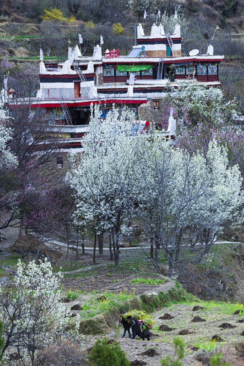 春天的丹巴,碧葉輕蕊,梨花堆雪。房前屋后,山腰山脊皆是滿眼的淡白梨花瓣。暖暖的微風(fēng)吹過(guò),滿樹的花瓣帶著泥土與花香撲鼻而來(lái)。藏寨、碉樓、繁花,美不勝收。