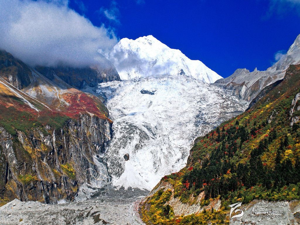 海螺溝位于四川省甘孜藏族自治州東南部,貢嘎山東坡,是青藏高原東緣的極高山地。海螺溝位于貢嘎雪峰腳下,以低海拔現(xiàn)代冰川著稱于世。晶瑩的現(xiàn)代冰川從高峻的山谷鋪瀉而下。海螺溝是亞洲最東低海拔現(xiàn)代冰川發(fā)現(xiàn)地,海拔2850米。其大冰瀑布高1080米,寬0.5米-1100米,是中國至今發(fā)現(xiàn)的最高大冰瀑布。溝內(nèi)蘊(yùn)藏有大流量沸熱溫冷礦泉,大面積原始森林和高的冰蝕山峰,大量的珍稀動植物資源,金山、銀山交相輝映,蔚為壯觀。
