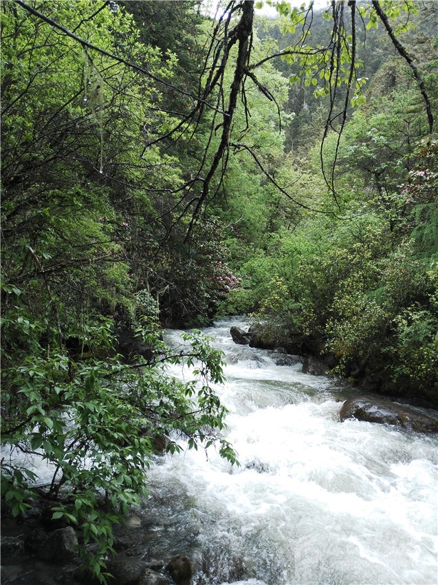 杜鵑花!又有美女的驚叫把我們的視線拉到了另一個(gè)方向,也即我們左手山坡上,一大片姹紫嫣紅的杜鵑花正灼灼綻放于郁郁蔥蔥的林木之間。而這時(shí)也就發(fā)現(xiàn)了,左手邊其實(shí)是一片花的海洋,各類不知名的花朵競(jìng)相爭(zhēng)艷,把拉角溝初晴的時(shí)空打扮得格外妖艷。于是眾人紛紛拿出手機(jī)兼相機(jī),將這難得一見的景致拍攝下來,而這一過程中,美女們總忘不了騷首弄姿地把自己擺進(jìn)畫面之中,雖然這些美女都是妖婆級(jí)的美女了。至于男士,多數(shù)則呵呵笑著看著,頗有閑庭信步、云卷云舒之意。