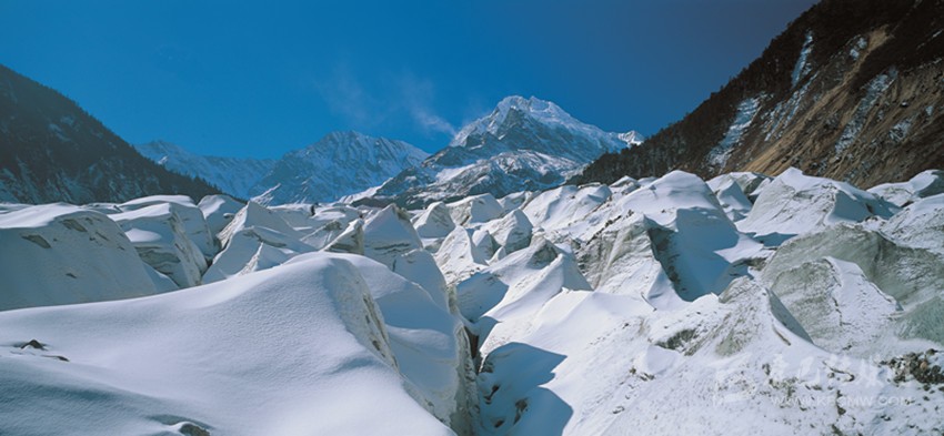 貢嘎山是我國現(xiàn)代海洋性冰川最發(fā)達(dá)的地區(qū),有數(shù)百條冰川。面積達(dá)300余平方公里。其中海螺溝一號(hào)冰川長14.7公里,面積16平方公里,是世界上同緯度海拔最低、最大的現(xiàn)代冰川,冰川、森林、溫泉共生,普通游客也可以輕松登臨進(jìn)行游覽。冰川上形成的冰面湖、冰塔、冰橋、冰洞、冰裂縫、冰宮、冰城門等千姿百態(tài),晶瑩璀璨。尤其是大冰瀑布的寬度和高度均超過了1000米,由無數(shù)巨大而光芒四射的冰塊組成,仿佛是從藍(lán)天直瀉而下的一道銀河,終日冰崩不斷。