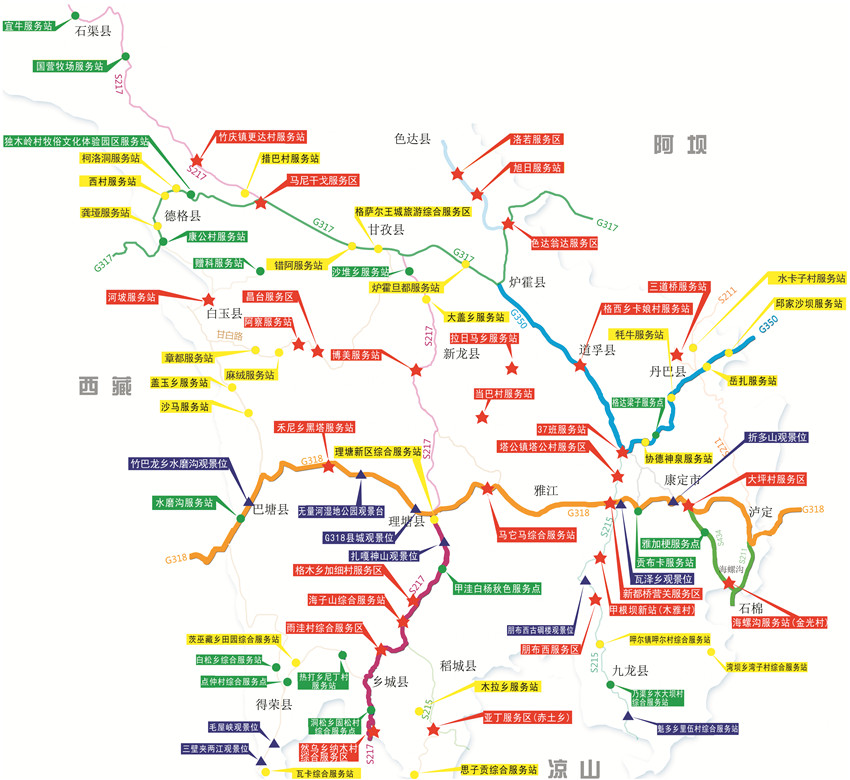 77個服務(wù)區(qū)(站、點)地處我州六條旅游線路和十條景觀大道。主要集中在:G318線(瀘定——康定——雅江——理塘——巴塘),G350線(丹巴——八美——道孚——爐霍——色達),S217線(理塘——稻城——香格里拉鎮(zhèn)——亞?。?,S211線、S434線(瀘定——海螺溝——榆林)。