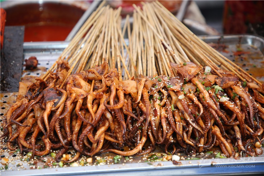 作為一個(gè)四川人,對(duì)于麻辣味的食物毫無抵抗力,在康定后街林立的商鋪中,記者一眼就相中了“深海魷魚花”這家店??粗褐t油的魷魚花靜靜地躺在紅椒和芹菜間,記者咽了咽口水,向老板買了一份兒?!罢媸羌兗兊拇ㄎ秲簺]錯(cuò)了,又麻又辣的?!庇浾邔?duì)老板說。老板回答到:“魷魚花最講究的就是刀法了,要切得好看。雖然在顧客看來都差不多樣子,但是我每次都要經(jīng)過細(xì)細(xì)斟酌再一刀一刀的切,爭(zhēng)取多弄幾種樣式,現(xiàn)在我的??蛡円矔?huì)細(xì)細(xì)地考究我切的魷魚花了。以前我只賣烤魷魚,只是在家里偶爾會(huì)給我兒子做魷魚花,后來看我兒子喜歡吃,才開始慢慢地賣魷魚花,沒想到還是很受歡迎。這次美食節(jié),我發(fā)現(xiàn)沒有人做魷魚花,所以我就帶著我兒子喜歡的魷魚花來參加這次美食節(jié)了?!崩习逍χ浾哒f。