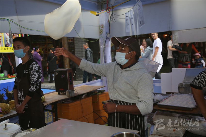要說美食節(jié)最炫酷的店鋪,那非“印度飛餅”莫屬了。記者穿過層層圍觀的人群,點(diǎn)了一份菠蘿飛餅。只見廚師將捏好的面團(tuán)在案板上揉了幾下,便捏緊面餅一端按順時(shí)針方向轉(zhuǎn)動(dòng),手里的面餅越轉(zhuǎn)越大,越轉(zhuǎn)越薄,幾近透明,接著就是放餡料,稍做煎炸,切割裝盤,短短一分鐘內(nèi),一氣呵成。記者接過盤,咬下一口,“喀嚓”一聲,再一口就吃到了菠蘿的清香,外層淺黃松脆,內(nèi)層綿軟白皙,略帶甜味,好一個(gè)外脆內(nèi)嫩??!嚼起來層次豐富,一軟一脆,口感對(duì)比強(qiáng)烈,嚼過之后,齒頰留芳。當(dāng)脆餅撞上菠蘿的清香,就像在夏天突然掉進(jìn)一個(gè)水池,清爽又驚喜?!案杏X就是一件的藝術(shù)品啊!”如此的驚嘆聲從人群中迸發(fā)出來。