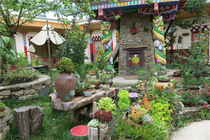 這座民宿坐落于克格依村,緊鄰原生態(tài)田園,庭外滿目青翠、古碉林立,庭內花草滿園、瓜果飄香,時而傳來一聲鳥鳴,更顯園中幽靜。民宿的前臺既是游客接待中心,也是一座小型的博物館,展示著古宅數(shù)代主人的精心收藏。