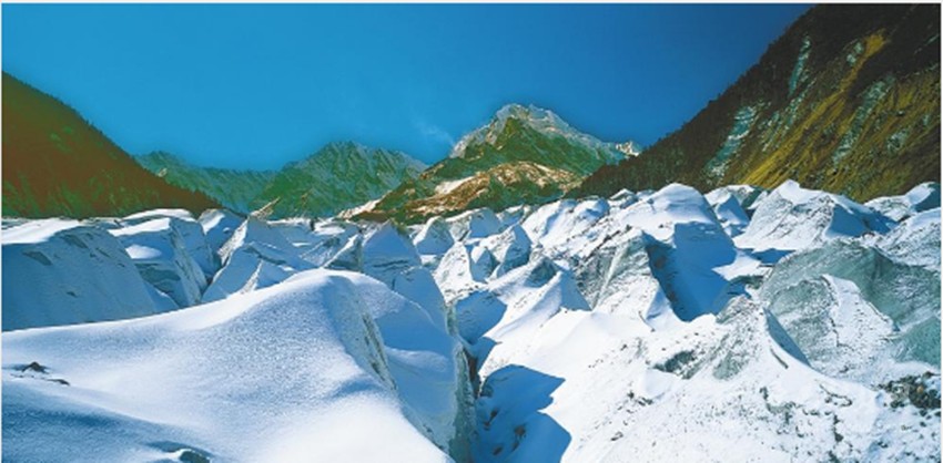 這里有著舉世無雙的大冰瀑布,在冰川的運(yùn)動(dòng)中,形成晶瑩如翡翠、水晶的冰川弧拱、冰洞、冰階梯、冰門、冰湖、冰峰。