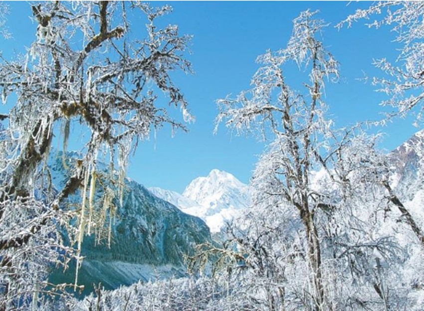 雪是柔情的,石山是墨翠的,猶如一幅冬日寫意圖,橫亙?cè)谔斓刂g的美色,而這就存在于冬季的道孚。