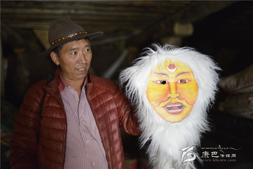 午飯后,洛絨丹巴帶我到離家不遠的一個小院,推開底樓嘎吱作響的木門,借助外面的光亮,看見有幾個巨大的鐵皮箱。洛絨丹巴打開一口箱子,不想里面整齊地放著各種戲服;第二口箱子是頭飾,唐朝文成公主的、清朝皇帝的。這些服裝和頭飾多是模仿電視電影,或者加上想象自己制作的,個別是外地方買回的。最具特色是第三口箱子,用牛皮制作的各種面具、表情十分夸張,有和善的、猙獰的、威風(fēng)的,神情各異。面具的顏色各種各樣,白色、黑色、黃色、紅色等。眼睛和嘴巴處挖了窟窿,有的還在面具外圍綴了一圈羊毛。洛絨丹巴指點著各種顏色的面具介紹:白色代表純潔、紅色代表威嚴(yán)、黃色代表吉祥;巫女則半黑半白,象征其兩面三刀的性格;青面獠牙代表妖魔。說起這些他如數(shù)家珍。