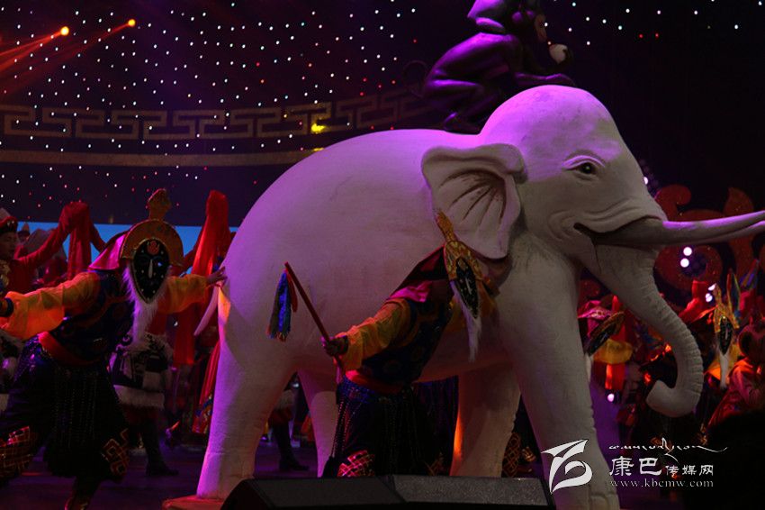 此次藏歷新年春晚被命名為“圣潔家園”,為了應(yīng)“家園”這個景,導(dǎo)演組頗有“心機(jī)”的將藏元素“和睦四瑞”搬上了舞臺,在開場舞中,兩個用石膏打造的、栩栩如生的“和睦四瑞”被演員緩緩?fù)粕衔枧_,贏得觀眾陣陣歡呼。在民間傳說中大象、猴子、白兔、貢布鳥共同發(fā)愿行持善法,貢布鳥鼓勵同伴們開始持守五戒,并一直堅持不懈動員其它眾生嚴(yán)守五戒。在它們帶動、勸說下,動物們都能漸漸做到互不損害、如理如法在木森林中和平度日,以其厲行善法之因,天人也降下和合雨水。后來,整個大地之上,莊稼豐熟、植物茂密、鮮妍之花滿目盛開,整個國家喜獲豐收、財富圓滿。晚會也是想利用“和睦四瑞”寓意人民生活團(tuán)結(jié)和睦、和平寧靜的美好愿望。