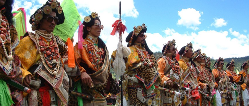 同時,因為康巴藏區(qū)雪峰林立,氣候寒冷。以號稱地球第三極地聞名遐邇。康巴人民世世代代就在這世界屋脊上過著“逐水草而居”的游牧和半牧半農(nóng)的生活。因而在服飾上也形成了具有典型的雪域高原民族獨有的地方風(fēng)格特色。總體呈現(xiàn)出寬大粗獷、英武健美、豪氣颯爽的特點和大襟、寬腰、長袖、超長、無扣的特征。而色彩是康巴藏族服飾點綴美的靈魂,他們在色彩運用上十分著重色塊與整體的相襯與和諧,其運用最多的紅、黃、藍、綠、白、黑,往往包含了宗教的象征意蘊,又歸納了雪域大自然所呈現(xiàn)的直觀表征:他們認為藍、白、綠、紅、黃五彩是菩薩的服裝,藍色代表藍天,白色表示白云,綠色表示河流,紅色表示空間護法神,黃色表示大地。這是康巴人貼近自然的感恩之情和神性世界的精神延續(xù)的又一直接表達。