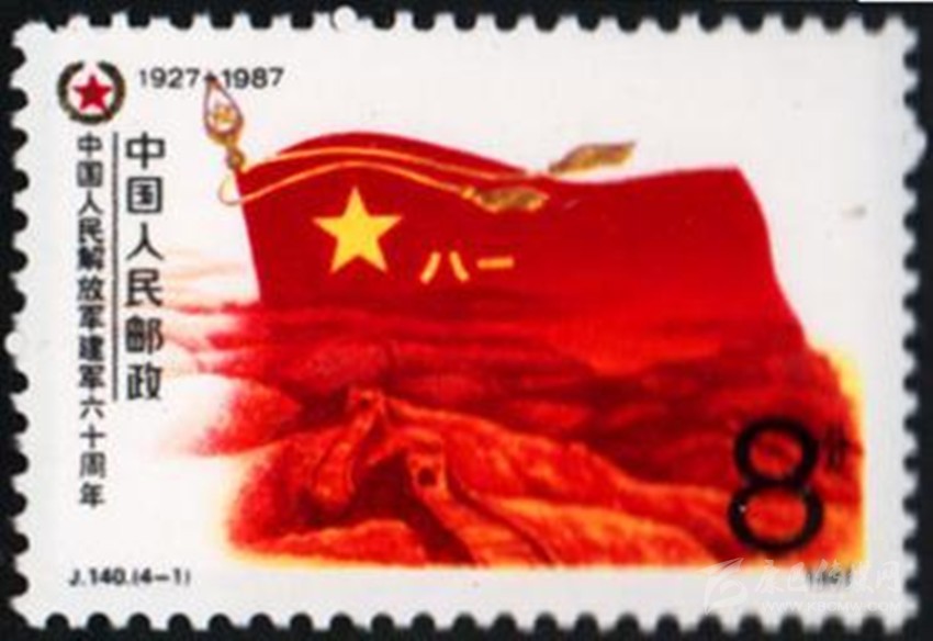 1977年8月1日原郵電部發(fā)行的《中國(guó)人民解放軍建軍50周年》紀(jì)念郵票,其中第4枚“雄師過(guò)大江”,圖案中一名沖在渡江隊(duì)伍前面的戰(zhàn)士高舉一面“八一”軍旗。1987年8月1日原郵電部發(fā)行的《中國(guó)人民解放軍建軍60周年》紀(jì)念郵票一套4枚。其中第1枚“軍魂”,郵票上一面鮮紅的“八一”軍旗迎風(fēng)飄揚(yáng),旗下是蜿蜒的萬(wàn)里長(zhǎng)城,代表了中國(guó)人民解放軍是保衛(wèi)祖國(guó)和人民的“鋼鐵長(zhǎng)城”。1995年8月1日,原郵電部試發(fā)行一套“義務(wù)兵專用”郵票一套1枚,票名為“神圣的使命”,圖案以紅光四射的“八一”軍旗為背景,以現(xiàn)代化的飛機(jī)、坦克、火箭和象征和平的白鴿為襯托,畫面是威武的陸海空三軍,顯示我軍鋼鐵長(zhǎng)城般攻無(wú)不克、戰(zhàn)無(wú)不勝的精神風(fēng)貌。