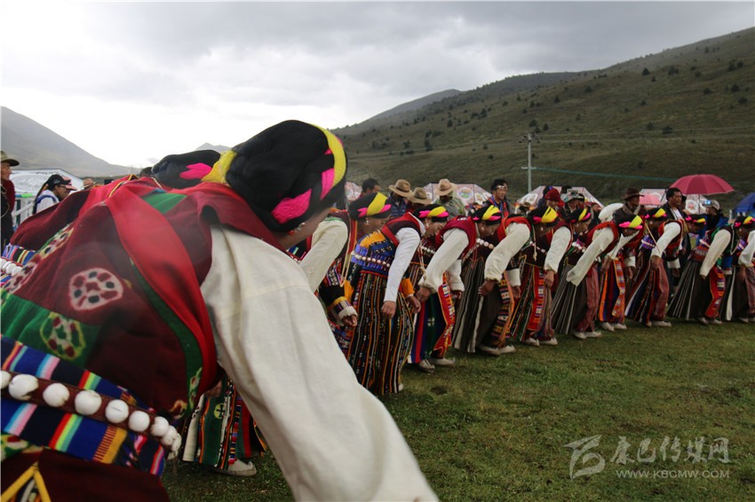 10月2日,在木雅鍋莊悠揚的旋律和輕盈的舞步中,歷時兩天的“2017康定情歌國際音樂節(jié)”盛大開幕,作為“五大民俗展演”中的特色民俗歌舞表演部分,木雅鍋莊吸引了眾多游客的關(guān)注。木雅鍋莊來源于木雅人的日常生產(chǎn)和生活,是當?shù)剞r(nóng)耕文化習俗的重要表現(xiàn),表演服飾多以棕紅色外套,紅、白色襯衫為主,表演者多佩戴紅頭繩、珊瑚、金銀等裝飾物。舞蹈分男女兩組,列隊圍桌成圓形,皆彎腰垂首隨領(lǐng)唱歌聲而舞。男組舞姿氣勢豪放,女組舞姿委婉優(yōu)雅。唱腔宛轉(zhuǎn)悠揚,吸引了在場觀眾冒雨駐足觀看,有的甚至情不自禁隨著舞群踏起了舞步,融入到康巴文化的神秘魅力當中。